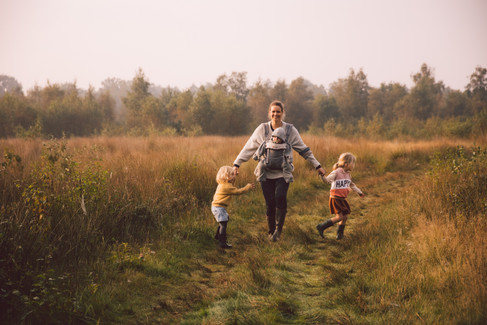 We zien een grote buizerd wegvliegen over de hei terwijl we door een stukje jong berkenbos wandelen en het zachte, ruisende geluid van de Bunkerbaan wegsterft. We komen aan ƩƩn van de mooiste uitzichten die we in lange tijd mochten ervaren. Het wasven ligt daar zo elegant, wat lager in het midden van de hei, lieflijk omgeven door de gouden kleuren van de uitdovende grassen. Anna en Robin sprinten over een klein paadje tot aan de rand van het ven. Het landschap wordt opener, voelt een tikkeltje Afrikaans aan en in de verte duiken de eerste golvende stuifzandduintjes op. We beslissen om er nog anderhalve km aan te breien.