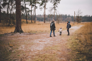 Een lage slagboom verwittigt ons dat we in kwetsbaar gebied zijn. Het bos opent zich en we komen op een prachtige gouden zandweg die zich glooiend door het heidelandschap slingert (net als de buizerd die verschrikt het hazenpad kiest). Net op tijd want de eerste snackzeurtjes steken de kop op. Ik loop om ter snelst tegen Anna met Robin op de rug de heuvel op ‘King of the hill’ waar we gezellig snacken. Saar is blij met een uitzonderlijke familiefoto gezien zowel omi als mammi mee op stap zijn. Anna loopt snel een bocht vooruit en doet ons verschieten. We zingen en we trekken Robin verder met de belofte dat ze van de laatste zandheuvel mag rollen naar het betoverend zwaluwmeer. Zo gezegd zo gedaan en ze rolden stevig het weekend in.